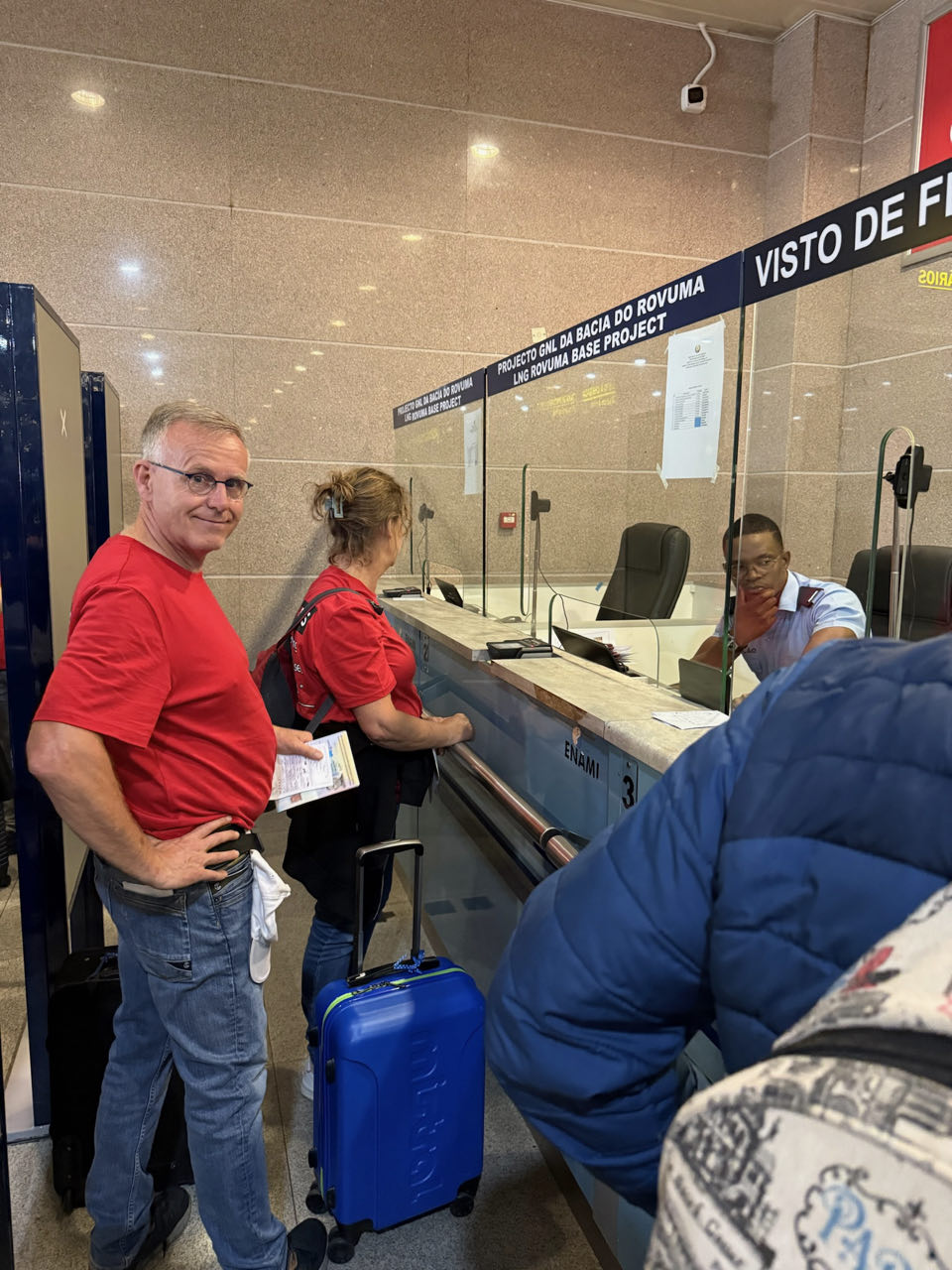 Na, dus een vlucht van veel slapen en veel kinderen(alvast wennen voor het weeshuis) landden we dus in Mozambique. We mochten de ETA die we vanaf mei verplicht zouden moeten invullen voor aankomst, dat werkte niet. Dus we mochten gezellig met z’n allen weer immigratiepapiertjes invullen en in de rij. Super, alles ging lekker op Afrikaanstempo. (Traag) en toen we eindelijk aan de beurt waren, dacht iemand die de belangrijke gasten voor de president moest inchecken, wel ff voor te kunnen.. daar dacht Muriël anders over. Na een “ik ben onderdeel van een team”, “ik ook, kijk de shirts”, “maar deze mensen moeten naar de president”, “er wachten 30 kinderen op ons”, “we moeten wel respect hebben” “ja, dus jij ook voor mij en we staan al de hele tijd in de rij”, liet hij me toch wel voorgaan, iets met een reis van 24 uur en gewoon weg willen van de luchthaven.