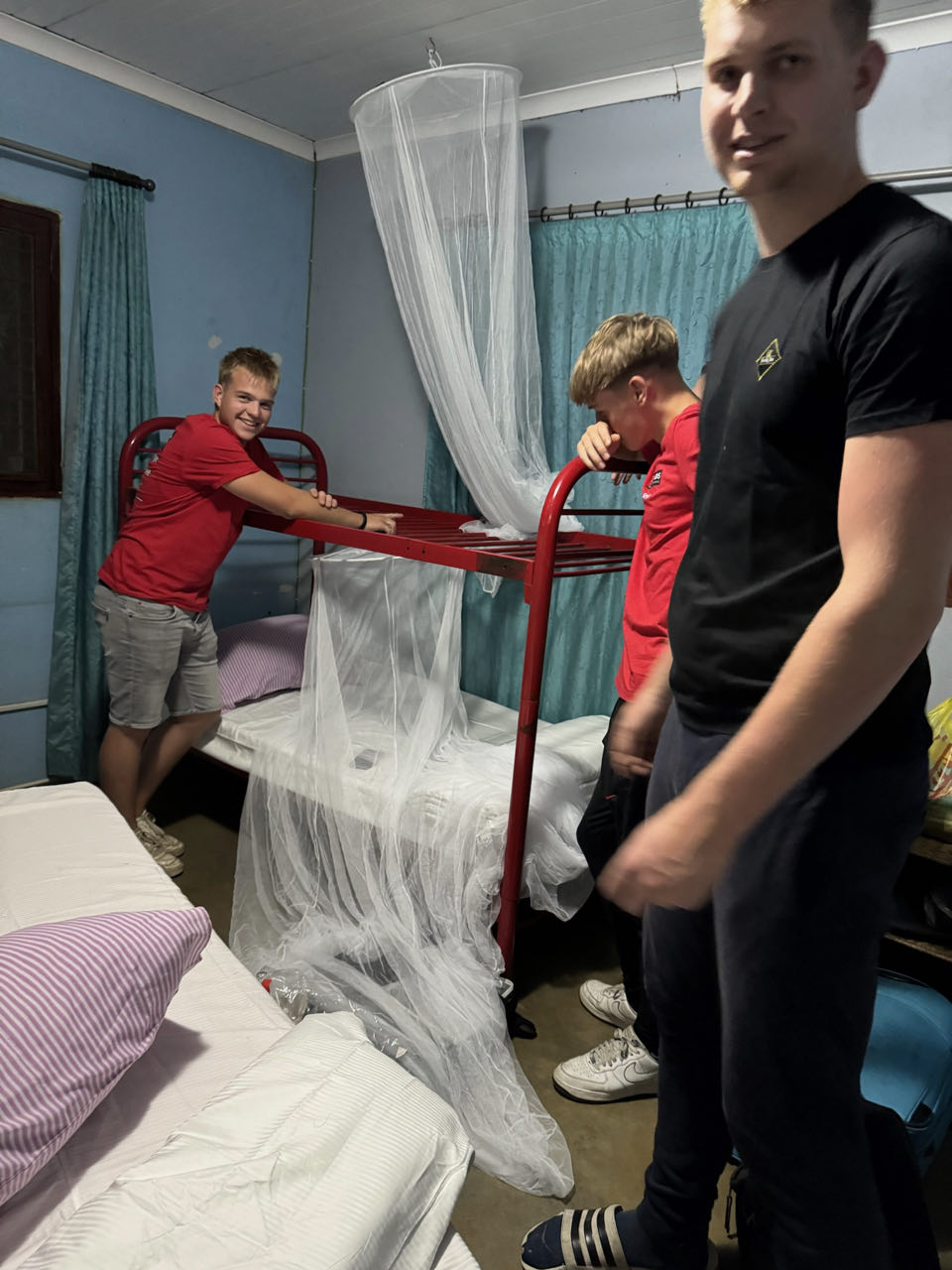 Toen ging om 22:00 toch wel echt het lampje uit.. was het idee.. want! Klamboes moesten nog opgehangen worden in Casa Fé! De mannen in Promessa hadden al een zeer creatieve manier gevonden (zie foto’s), nu wij nog.. dan maar haken in het plafond draaien. Na heel wat lachen, konden om 22:30 toch echt de oogjes toe. Morgenochtend mogen we namelijk om 9:30 weer in de kerk zijn!